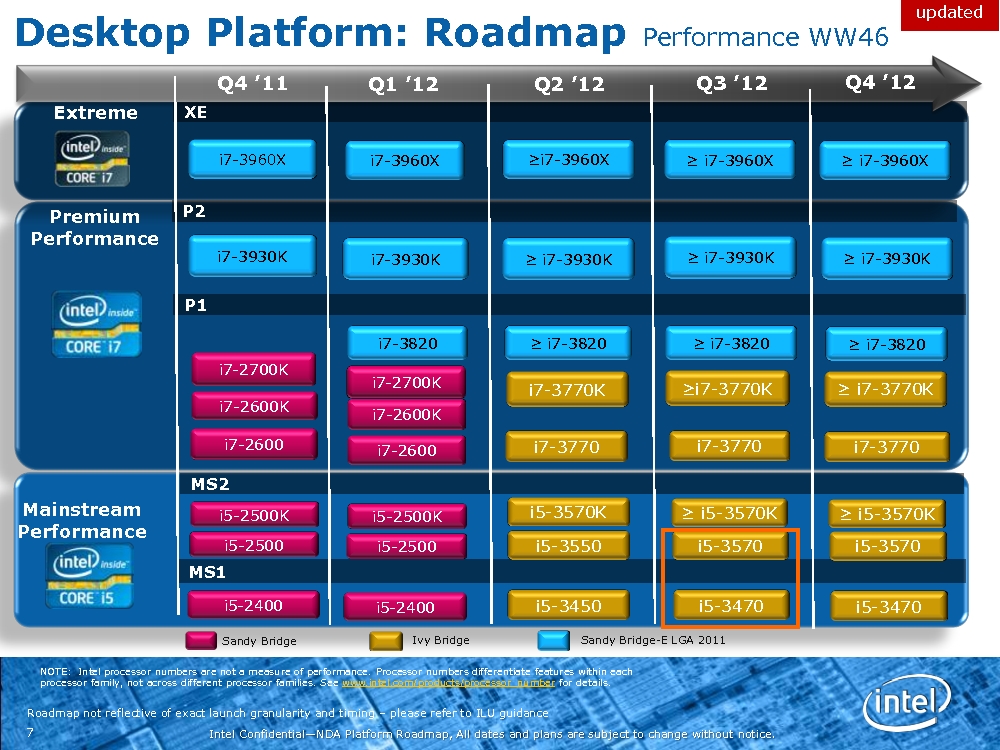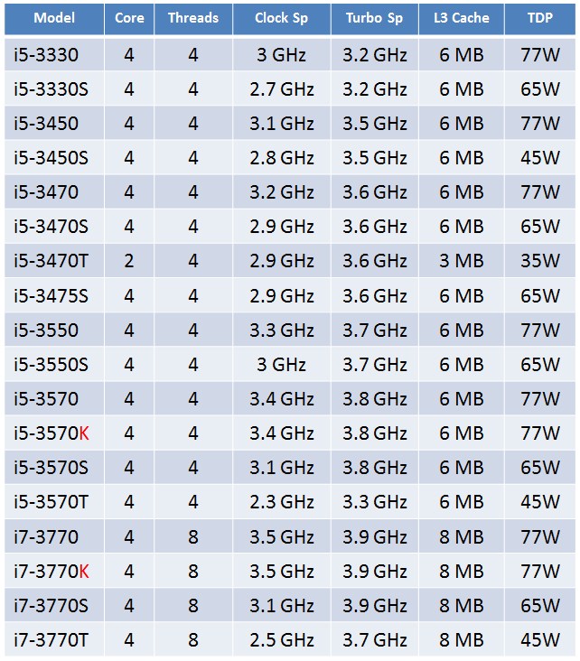 Intel will begin with Core i3-32xx (xx = TBD), i5-3450, i5-3550, i5-3570K, i7-3770, and i7-3770K. Around this time, there will be a market transition among cheaper Core i3 parts. In Q3 2012, i5-3470 and i5-3570 will displace i5-3450 and i5-3550; while a faster Core i7-37x0K processor will displace the i7-3770K.