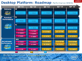 Many of these model numbers are confirmed on the latest roadmap slide detailing the Core processor family for 2012.The new line of Intel CPUs, dubbed the Ivy Bridge series, is set to ship in the second quarter of 2012, narrowing the timeframe from the previously-announced first half of 2012. Leaked specifications for i5 and i7 desktop processors confirm that Intel is focusing on improved graphics and lower power consumption. The eight standard chips have a 19 percent lower TDP than their current Sandy Bridge equivalents, meaning they'll require less power to dissipate heat, and Intel has increased its list of low-power chips from six to ten, something which fits with Intel's long-term goal of improving efficiency.
